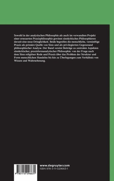 Sowohl in der analytischen Philosophie als auch im verwandten Projekt einer erneuerten Praxisphilosophie gewinnt sinnkritisches Philosophieren derzeit eine neue Dringlichkeit. Beide begreifen die menschliche, vernünftige Praxis als primäre Quelle von Sinn und als privilegierten Gegenstand philosophischer Analyse. Der Band vereint Beiträge zu zentralen Aspekten sinnkritischer, praxisformanalytischer Philosophie: von der Frage nach dem Sinn religiöser Rede und Praxis über das Problem der Struktur und die Form menschlichen Handelns bis hin zu Überlegungen zum Verhältnis von Wissen und Wahrnehmung.