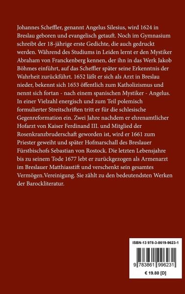 Johannes Scheffler, genannt Angelus Silesius, wird 1624 in Breslau geboren und evangelisch getauft. Noch im Gymnasium schreibt der 18-jährige erste Gedichte, die auch gedruckt werden. Während des Studiums in Leiden lernt er den Mystiker Abraham von Franckenberg kennen, der ihn in das Werk Jakob Böhmes einführt, auf das Scheffler später seine Erkenntnis derWahrheit zurückführt. 1652 läßt er sich als Arzt in Breslau nieder, bekennt sich 1653 öffentlich zum Katholizismus und nennt sich fortan - nach einem spanischen Mystiker - Angelus. In einer Vielzahl energisch und zum Teil polemisch formulierter Streitschriften tritt er für die schlesische Gegenreformation ein. Zwei Jahre nachdem er ehrenamtlicher Hofarzt von Kaiser Ferdinand III. und Mitglied der Rosenkranzbruderschaft geworden ist, wird er 1661 zum Priester geweiht und später Hofmarschall des Breslauer Fürstbischofs Sebastian von Rostock. Die letzten Lebensjahre bis zu seinem Tode 1677 lebt er zurückgezogen als Armenarzt im Breslauer Matthiasstift und verschenkt sein gesamtes Vermögen. Seine Lyrik reflektiert die Liebe der Seele zu ihrem Heiland, das tiefe religiöse Empfinden und die mystische Vereinigung. Sie zählt zu den bedeutendsten Werken der Barockliteratur.