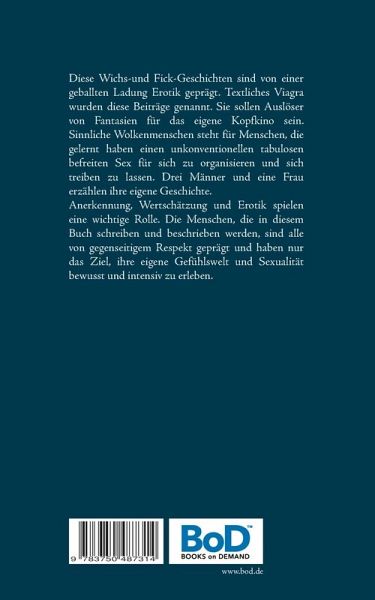 Diese Wichs-und Fick-Geschichten sind von einer geballten Ladung Erotik geprägt. Textliches Viagra wurden diese Beiträge genannt. Sie sollen Auslöser von Fantasien für das eigene Kopfkino sein. Sinnliche Wolkenmenschen steht für Menschen, die gelernt haben einen unkonventionellen tabulosen befreiten Sex für sich zu organisieren und sich treiben zu lassen. Drei Männer und eine Frau erzählen ihre eigene Geschichte.Anerkennung, Wertschätzung und Erotik spielen eine wichtige Rolle. Die Menschen, die in diesem Buch schreiben und beschrieben werden, sind alle von gegenseitigem Respekt geprägt und haben nur das Ziel, ihre eigene Gefühlswelt und Sexualität bewusst und intensiv zu erleben.