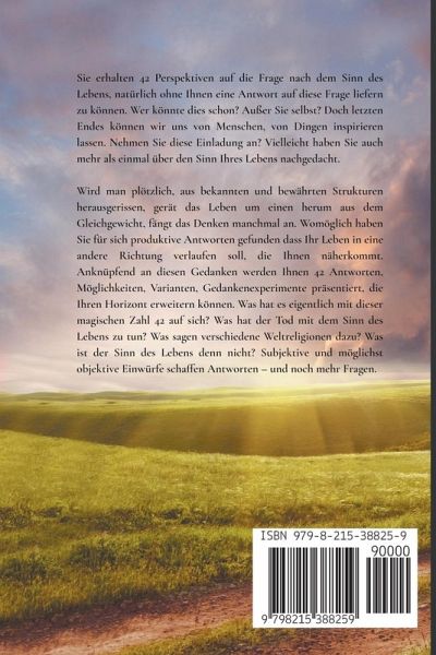 Sie erhalten 42 Perspektiven auf die Frage nach dem Sinn des Lebens, natürlich ohne Ihnen eine Antwort auf diese Frage liefern zu können. Wer könnte dies schon? Außer Sie selbst? Doch letzten Endes können wir uns von Menschen, von Dingen inspirieren lassen. Nehmen Sie diese Einladung an? Vielleicht haben Sie auch mehr als einmal über den Sinn Ihres Lebens nachgedacht.