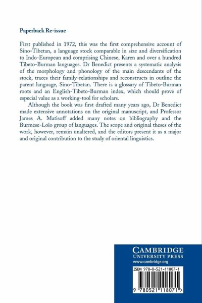 A comprehensive account of the Sino-Tibetan, a language stock comparable in size and diversification to Indo-European and comprising Chinese, Karen and over a hundred Tibetan-Burman languages. Dr Benedict presents a systematic analysis of the morphology and phonology of the main descendants of the stock, traces their family relationships and reconstructs in outline the parent language, Sino-Tibetan. There is a glossary of Tibeto-Burman index, which should prove of especial value as a working tool for scholars. Although the book was first drafted many years ago, Dr Benedict made extensive annotations on the original manuscript and Professor James A. Matisoff added many notes on bibliography and the Burmese-Lolo group of languages. The scope and original theses of the work, however, remain unaltered and the editors present it as a major and original contribution to the study of oriental linguistics.