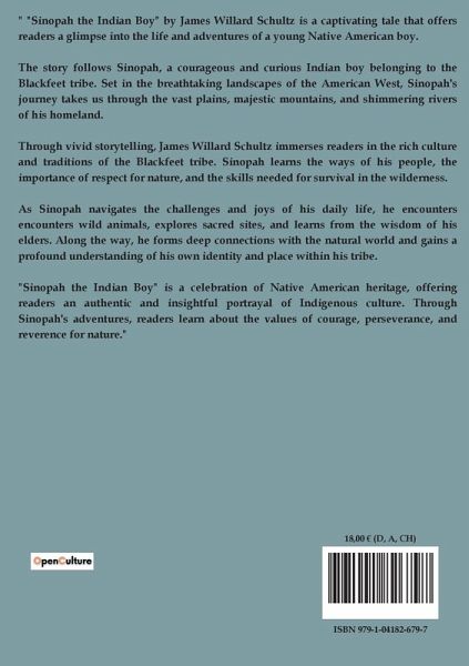 " "Sinopah the Indian Boy" by James Willard Schultz is a captivating tale that offers readers a glimpse into the life and adventures of a young Native American boy. The story follows Sinopah, a courageous and curious Indian boy belonging to the Blackfeet tribe. Set in the breathtaking landscapes of the American West, Sinopah's journey takes us through the vast plains, majestic mountains, and shimmering rivers of his homeland. Through vivid storytelling, James Willard Schultz immerses readers in the rich culture and traditions of the Blackfeet tribe. Sinopah learns the ways of his people, the importance of respect for nature, and the skills needed for survival in the wilderness. As Sinopah navigates the challenges and joys of his daily life, he encounters encounters wild animals, explores sacred sites, and learns from the wisdom of his elders. Along the way, he forms deep connections with the natural world and gains a profound understanding of his own identity and place within his tribe. "Sinopah the Indian Boy" is a celebration of Native American heritage, offering readers an authentic and insightful portrayal of Indigenous culture. Through Sinopah's adventures, readers learn about the values of courage, perseverance, and reverence for nature."