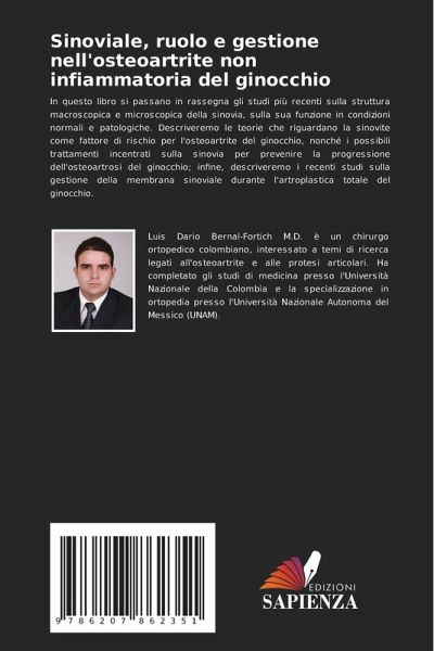 In questo libro si passano in rassegna gli studi più recenti sulla struttura macroscopica e microscopica della sinovia, sulla sua funzione in condizioni normali e patologiche. Descriveremo le teorie che riguardano la sinovite come fattore di rischio per l'osteoartrite del ginocchio, nonché i possibili trattamenti incentrati sulla sinovia per prevenire la progressione dell'osteoartrosi del ginocchio; infine, descriveremo i recenti studi sulla gestione della membrana sinoviale durante l'artroplastica totale del ginocchio.