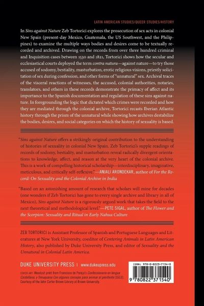In Sins against Nature Zeb Tortorici explores the prosecution of sex acts in colonial New Spain (present-day Mexico, Guatemala, the US Southwest, and the Philippines) to examine the multiple ways bodies and desires come to be textually recorded and archived. Drawing on the records from over three hundred criminal and Inquisition cases between 1530 and 1821, Tortorici shows how the secular and ecclesiastical courts deployed the term contra natura-against nature-to try those accused of sodomy, bestiality, masturbation, erotic religious visions, priestly solicitation of sex during confession, and other forms of "unnatural" sex. Archival traces of the visceral reactions of witnesses, the accused, colonial authorities, notaries, translators, and others in these records demonstrate the primacy of affect and its importance to the Spanish documentation and regulation of these sins against nature. In foregrounding the logic that dictated which crimes were recorded and how they are mediated through the colonial archive, Tortorici recasts Iberian Atlantic history through the prism of the unnatural while showing how archives destabilize the bodies, desires, and social categories on which the history of sexuality is based.