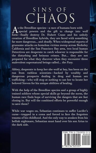 As the Breedline species-a race of humans born with special powers and the gift to change into wolf form-finally destroy Dr. Hubert Crane and his unholy creation of Breedline hybrids, they are faced with something far more dangerous... and deadly. When widespread reports of gruesome attacks on homeless victims sweep across Berkeley California and the San Francisco Bay area, two local human Detectives are desperate to catch whoever is responsible for the disturbing and heinous crimes. But... they are not prepared for what they discover when they encounter three malevolent supernatural beings called... the Fury. Abbey, desperate to keep her she-wolf at bay, has been on the run from ruthless scientists-backed by wealthy and dangerous prospects dealing in drug and human sex trafficking-who will stop at nothing to use her to locate her beloved Steven for his unique abilities of healing. With the help of the Breedline species and a group of highly trained soldiers whose special skills go beyond the norm, the human race finds hope of surviving the dangers that are fast closing in. But will the combined efforts be powerful enough to save them? While war wages on, Sebastian continues to suffer Lucifer's curse-trapped in a coma and forced to face the forgotten trauma of his childhood. And the only way to awaken from his hellish nightmare, Sebastian must hand over his son Arius to the dark side.