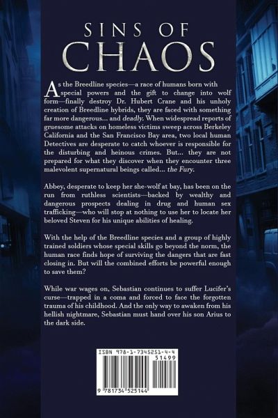 As the Breedline species-a race of humans born with special powers and the gift to change into wolf form-finally destroy Dr. Hubert Crane and his unholy creation of Breedline hybrids, they are faced with something far more dangerous... and deadly. When widespread reports of gruesome attacks on homeless victims sweep across Berkeley California and the San Francisco Bay area, two local human Detectives are desperate to catch whoever is responsible for the disturbing and heinous crimes. But... they are not prepared for what they discover when they encounter three malevolent supernatural beings called... the Fury. Abbey, desperate to keep her she-wolf at bay, has been on the run from ruthless scientists-backed by wealthy and dangerous prospects dealing in drug and human sex trafficking-who will stop at nothing to use her to locate her beloved Steven for his unique abilities of healing. With the help of the Breedline species and a group of highly trained soldiers whose special skills go beyond the norm, the human race finds hope of surviving the dangers that are fast closing in. But will the combined efforts be powerful enough to save them? While war wages on, Sebastian continues to suffer Lucifer's curse-trapped in a coma and forced to face the forgotten trauma of his childhood. And the only way to awaken from his hellish nightmare, Sebastian must hand over his son Arius to the dark side.