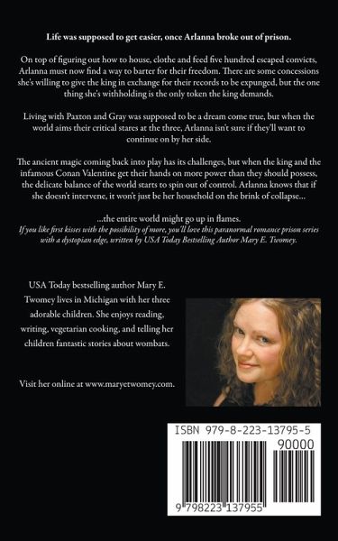Life was supposed to get easier, once Arlanna broke out of prison. On top of figuring out how to house, clothe and feed five hundred escaped convicts, Arlanna must now find a way to barter for their freedom. There are some concessions she's willing to give the king in exchange for their records to be expunged, but the one thing she's withholding is the only token the king demands. Living with Paxton and Gray was supposed to be a dream come true, but when the world aims their critical stares at the three, Arlanna isn't sure if they'll want to continue on by her side. The ancient magic coming back into play has its challenges, but when the king and the infamous Conan Valentine get their hands on more power than they should possess, the delicate balance of the world starts to spin out of control. Arlanna knows that if she doesn't intervene, it won't just be her household on the brink of collapse… …the entire world might go up in flames. If you like first kisses with the possibility of more, you'll love this paranormal romance prison series with a dystopian edge, written by USA Today Bestselling Author Mary E. Twomey.