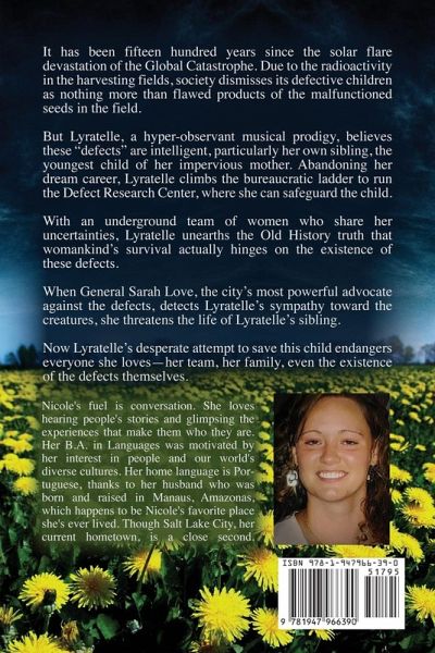 It has been fifteen hundred years since the solar flare devastation of the Global Catastrophe. Due to the radioactivity in the harvesting fields, society dismisses its defective children as nothing more than flawed products of the malfunctioned seeds in the field. But Lyratelle, a hyper-observant musical prodigy, believes these "defects" are intelligent, particularly her own sibling, the youngest child of her impervious mother. Abandoning her dream career, Lyratelle climbs the bureaucratic ladder to run the Defect Research Center, where she can safeguard the child. With an underground team of women who share her uncertainties, Lyratelle unearths the Old History truth that womankind's survival actually hinges on the existence of these defects. When General Sarah Love, the city's most powerful advocate against the defects, detects Lyratelle's sympathy toward the creatures, she threatens the life of Lyratelle's sibling. Now Lyratelle's desperate attempt to save this child endangers everyone she loves-her team, her family, even the existence of the defects themselves.