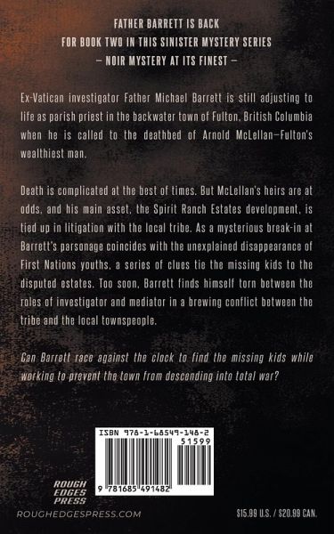 FATHER BARRETT IS BACK FOR BOOK TWO IN THIS SINISTER MYSTERY SERIES. Ex-Vatican investigator Father Michael Barrett is still adjusting to life as parish priest in the backwater town of Fulton, British Columbia when he is called to the deathbed of Arnold McLellan-Fulton's wealthiest man. Death is complicated at the best of times. But McLellan's heirs are at odds, and his main asset, the Spirit Ranch Estates development, is tied up in litigation with the local tribe. As a mysterious break-in at Barrett's parsonage coincides with the unexplained disappearance of First Nations youths, a series of clues tie the missing kids to the disputed estates. Too soon, Barrett finds himself torn between the roles of investigator and mediator in a brewing conflict between the tribe and the local townspeople. Can Barrett race against the clock to find the missing kids while working to prevent the town from descending into total war?