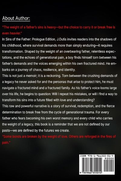 "The weight of a father's sins is heavy-but the choice to carry it or break free is even heavier." In Sins of the Father: Prologue Edition, J.Outis invites readers into the shadows of his childhood, where survival demands more than simply enduring-it requires transformation. Shaped by the weight of an overbearing father, relentless expectations, and the echoes of generational pain, a boy finds himself torn between his father's demands and the voices emerging within his own fractured mind. He embarks on a journey of chaos, resilience, and identity. This is not just a memoir; it is a reckoning. Torn between the crushing demands of a legacy he never asked for and the personas that arise to protect him, he must navigate a fractured mind and a fractured family. As his father's voice looms large over his life, he begins to question: Will I repeat his mistakes, or will I find a way to transform his sins into a future filled with love and understanding? This raw and powerful narrative is a story of survival, redemption, and the fierce determination to break free from the cycle of generational trauma. For every father who fears becoming his own worst memory and every child who carries the weight of a legacy, this book is a reminder that we are not defined by our pasts-we are defined by the futures we create. "Some bonds are broken by the weight of love. Others are reforged in the fires of pain."