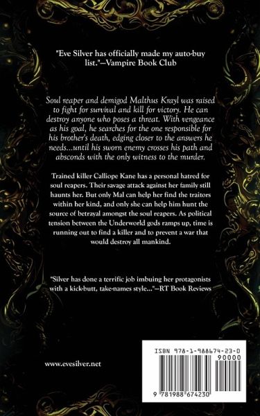 "Eve Silver has officially made my auto-buy list."-Vampire Book Club Soul reaper and demigod Malthus Krayl was raised to fight for survival and kill for victory. He can destroy anyone who poses a threat. With vengeance as his goal, he searches for the one responsible for his brother's death, edging closer to the answers he needs...until his sworn enemy crosses his path and absconds with the only witness to the murder. Trained killer Calliope Kane has a personal hatred for soul reapers. Their savage attack against her family still haunts her. But only Mal can help her find the traitors within her kind, and only she can help him hunt the source of betrayal amongst the soul reapers. As political tension between the Underworld gods ramps up, time is running out to find a killer and to prevent a war that would destroy all mankind. "Silver has done a terrific job imbuing her protagonists with a kick-butt, take-names style..."-RT Book Reviews