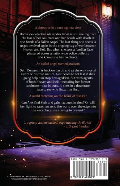 A detective with a secret. An exiled angel out for vengeance. And a world teetering on the brink of disaster. Homicide detective Alexandra Jarvis is still reeling from the loss of her soulmate and her brush with death at the hands of a Fallen Angel. The last thing she wants is to get involved again in the ongoing tug-of-war between Heaven and Hell. But when she sees Seth Benjamin's face plastered across a nationwide police bulletin, she knows she has no choice. As the only mortal aware of Seth's true nature, she needs to act fast if she's going to save Seth and give him a chance to stop Armageddon. And she'll have to go up against her former soulmate to do it. Can Alex gain Seth's trust in time? Or will her fight to save him send the world over the edge into the very chaos she's desperately trying to avoid?