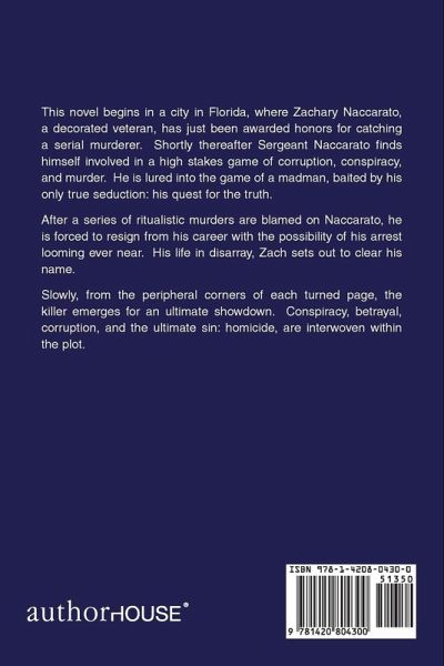 This novel begins in a city in Florida, where Zachary Naccarato, a decorated veteran, has just been awarded honors for catching a serial murderer. Shortly thereafter Sergeant Naccarato finds himself involved in a high stakes game of corruption, conspiracy, and murder. He is lured into the game of a madman, baited by his only true seduction: his quest for the truth. After a series of ritualistic murders are blamed on Naccarato, he is forced to resign from his career with the possibility of his arrest looming ever near. His life in disarray, Zach sets out to clear his name. Slowly, from the peripheral corners of each turned page, the killer emerges for an ultimate showdown. Conspiracy, betrayal, corruption, and the ultimate sin: homicide, are interwoven within the plot.