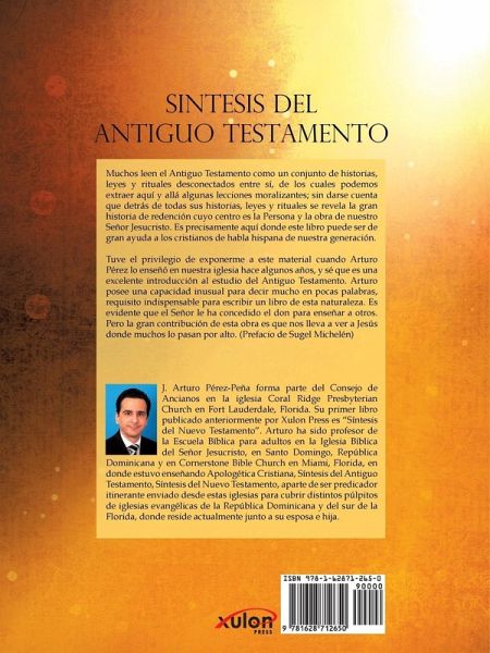Muchos leen el Antiguo Testamento como un conjunto de historias, leyes y rituales desconectados entre sí, de los cuales podemos extraer aquí y allá algunas lecciones moralizantes; sin darse cuenta que detrás de todas sus historias, leyes y rituales se revela la gran historia de redención cuyo centro es la Persona y la obra de nuestro Señor Jesucristo. Es precisamente aquí donde este libro puede ser de gran ayuda a los cristianos de habla hispana de nuestra generación. Tuve el privilegio de exponerme a este material cuando Arturo Pérez lo enseñó en nuestra iglesia hace algunos años, y sé que es una excelente introducción al estudio del Antiguo Testamento. Arturo posee una capacidad inusual para decir mucho en pocas palabras, requisito indispensable para escribir un libro de esta naturaleza. Es evidente que el Señor le ha concedido el don para enseñar a otros. Pero la gran contribución de esta obra es que nos lleva a ver a Jesús donde muchos lo pasan por alto. (Prefacio de Sugel Michelén) J. Arturo Pérez-Peña forma parte del Consejo de Ancianos en la iglesia Coral Ridge Presbyterian Church en Fort Lauderdale, Florida. Su primer libro publicado anteriormente por Xulon Press es "Síntesis del Nuevo Testamento". Arturo ha sido profesor de la Escuela Bíblica para adultos en la Iglesia Bíblica del Señor Jesucristo, en Santo Domingo, República Dominicana y en Cornerstone Bible Church en Miami, Florida, en donde estuvo enseñando Apologética Cristiana, Síntesis del Antiguo Testamento, Síntesis del Nuevo Testamento, aparte de ser predicador itinerante enviado desde estas iglesias para cubrir distintos púlpitos de iglesias evangélicas de la República Dominicana y del sur de la Florida, donde reside actualmente junto a su esposa e hija.