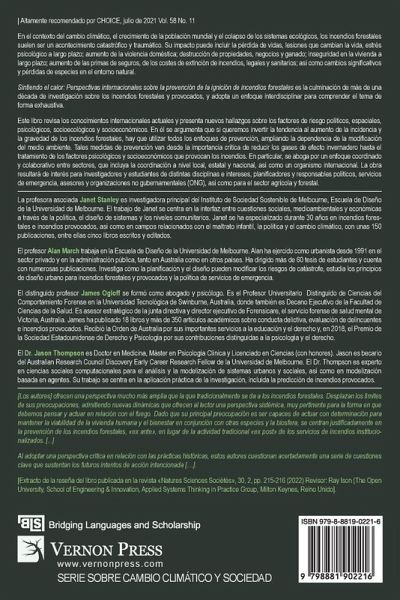 Altamente recomendado por CHOICE, julio de 2021 Vol. 58 No. 11 En el contexto del cambio climático, el crecimiento de la población mundial y el colapso de los sistemas ecológicos, los incendios forestales suelen ser un acontecimiento catastrófico y traumático. Su impacto puede incluir la pérdida de vidas, lesiones que cambian la vida, estrés psicológico a largo plazo; aumento de la violencia doméstica; destrucción de propiedades, negocios y ganado; inseguridad en la vivienda a largo plazo; aumento de las primas de seguros, de los costes de extinción de incendios, legales y sanitarios; así como cambios significativos y pérdidas de especies en el entorno natural. "Sintiendo el calor: Perspectivas internacionales sobre la prevención de la ignición de incendios forestales" es la culminación de más de una década de investigación sobre los incendios forestales y provocados, y adopta un enfoque interdisciplinar para comprender el tema de forma exhaustiva. Este libro revisa los conocimientos internacionales actuales y presenta nuevos hallazgos sobre los factores de riesgo políticos, espaciales, psicológicos, socioecológicos y socioeconómicos. En él se argumenta que si queremos invertir la tendencia al aumento de la incidencia y la gravedad de los incendios forestales, hay que utilizar todos los enfoques de prevención, ampliando la dependencia de la modificación del medio ambiente. Tales medidas de prevención van desde la importancia crítica de reducir los gases de efecto invernadero hasta el tratamiento de los factores psicológicos y socioeconómicos que provocan los incendios. En particular, se aboga por un enfoque coordinado y colaborativo entre sectores, que incluya la coordinación a nivel local, estatal y nacional, así como un organismo internacional. La obra resultará de interés para investigadores y estudiantes de distintas disciplinas e intereses, planificadores y responsables políticos, servicios de emergencia, asesores y organizaciones no gubernamentales (ONG), así como para el sector agrícola y forestal.