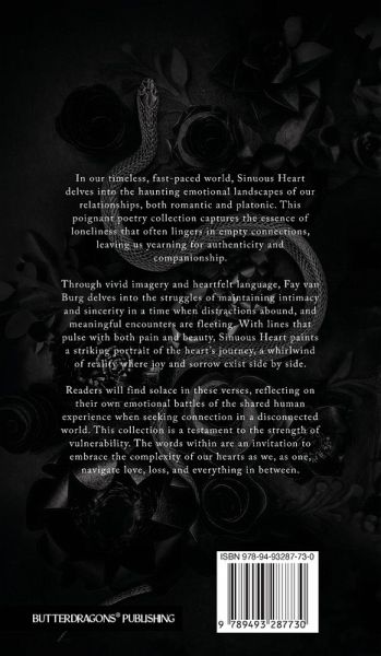 In our timeless, fast-paced world, Sinuous Heart delves into the haunting emotional landscapes of our relationships, both romantic and platonic. This poignant poetry collection captures the essence of loneliness that often lingers in empty connections, leaving us yearning for authenticity and companionship. Through vivid imagery and heartfelt language, Fay van Burg delves into the struggles of maintaining intimacy and sincerity in a time when distractions abound, and meaningful encounters are fleeting. With lines that pulse with both pain and beauty, Sinuous Heart paints a striking portrait of the heart's journey, a whirlwind of reality where joy and sorrow exist side by side. Readers will find solace in these verses, reflecting on their own emotional battles of the shared human experience when seeking connection in a disconnected world. This collection is a testament to the strength of vulnerability. The words within are an invitation to embrace the complexity of our hearts as we, as one, navigate love, loss, and everything in between.