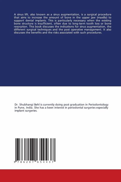 A sinus lift, also known as a sinus augmentation, is a surgical procedure that aims to increase the amount of bone in the upper jaw (maxilla) to support dental implants. This is particularly necessary when the existing bone structure is insufficient, often due to long-term tooth loss or bone resorption. This book discusses the indications for sinus augmentation, the different surgical techniques and the post operative management. It also discusses the benefits and the risks associated with such procedures.