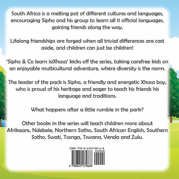 South Africa is a melting pot of different cultures and languages, encouraging Sipho and his group to learn aspects of the 11 official languages, gaining friends along the way. Lifelong friendships are forged when all trivial differences are cast aside, and children can just be children! 'Sipho & Co learn isiXhosa' kicks off the series, taking carefree kids on an enjoyable multicultural adventure, where diversity is the norm. The leader of the pack is Sipho, a friendly and energetic Xhosa boy, who is proud of his heritage and eager to teach his friends his language and traditions. What happens after a little rumble in the park? Other books in the series will teach children more about the official languages. From South African English to Zulu, they will explore Afrikaans' unique and captivating idiom, understand the soothing rhythms of Northern/Southern Sotho and Tswana, become acquainted with Ndebele and Swati unique clicks and identify the lack the vocal clicks in Tsonga and Venda. The series is a delightful education tool for kids, enabling them to appreciate South Africa's diverse language heritage and sparking their curiosity in linguistic exploration.