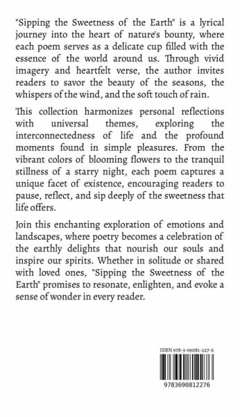 "Sipping the Sweetness of the Earth" is a lyrical journey into the heart of nature's bounty, where each poem serves as a delicate cup filled with the essence of the world around us. Through vivid imagery and heartfelt verse, the author invites readers to savor the beauty of the seasons, the whispers of the wind, and the soft touch of rain. This collection harmonizes personal reflections with universal themes, exploring the interconnectedness of life and the profound moments found in simple pleasures. From the vibrant colors of blooming flowers to the tranquil stillness of a starry night, each poem captures a unique facet of existence, encouraging readers to pause, reflect, and sip deeply of the sweetness that life offers. Join this enchanting exploration of emotions and landscapes, where poetry becomes a celebration of the earthly delights that nourish our souls and inspire our spirits. Whether in solitude or shared with loved ones, "Sipping the Sweetness of the Earth" promises to resonate, enlighten, and evoke a sense of wonder in every reader.