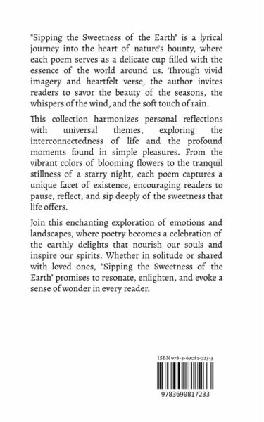 "Sipping the Sweetness of the Earth" is a lyrical journey into the heart of nature's bounty, where each poem serves as a delicate cup filled with the essence of the world around us. Through vivid imagery and heartfelt verse, the author invites readers to savor the beauty of the seasons, the whispers of the wind, and the soft touch of rain. This collection harmonizes personal reflections with universal themes, exploring the interconnectedness of life and the profound moments found in simple pleasures. From the vibrant colors of blooming flowers to the tranquil stillness of a starry night, each poem captures a unique facet of existence, encouraging readers to pause, reflect, and sip deeply of the sweetness that life offers. Join this enchanting exploration of emotions and landscapes, where poetry becomes a celebration of the earthly delights that nourish our souls and inspire our spirits. Whether in solitude or shared with loved ones, "Sipping the Sweetness of the Earth" promises to resonate, enlighten, and evoke a sense of wonder in every reader.