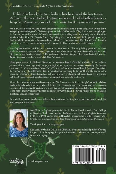 Join Sir Gawain on his journey to seek the green chapel and battle the green knight who dwells there. Accepting the challenge of a Christmas game on behalf of his uncle, King Arthur, the young knight, Sir Gawain, leaves his home of Camelot and travels afar, finding board at a stately castle. Received by a hospitable Host, Sir Gawain finds refuge along with many tests and challenges along the way. His final challenge awaits at the green chapel, where he is to receive a deathly blow of the ax from the green knight. The greatest challenge of all is young Sir Gawain staying honest to himself. Jane England received an F in the children’s literature course. The only failing grade of her entire academic career was on a mid-term paper she wrote about the anonymous fourteenth-century poem "Sir Gawain and the Green Knight." Her professor at the time disagreed that the well-studied piece of British literature was also a work of children’s literature. Many great works of children’s literature demonstrate Joseph Campbell’s thesis of the mythical journey of the hero depicting the psychological and spiritual maturation necessary for human existence. "Sir Gawain and the Green Knight" satisfies all the elements of Joseph Campbell’s thesis of the hero’s journey: the call to adventure, supernatural aid, crossing the threshold from the known to the unknown, beginning of transformation, aid from a helper, challenges and temptations, the revelation and the abyss, rebirth and transformation, atonement, and return to the known. Albeit, the anonymous fourteenth-century poem "Sir Gawain and the Green Knight" as written did not lend itself easily to be read by children. Ultimately the mutually agreed upon decision was to rewrite a portion of the fourteenth-century work into the text of children’s literature following the structure of the hero’s journey and proving that the tale of Sir Gawain and the Green Knight can be children’s literature. Challenge accepted. On and off for many years beyond college, Jane continued rewriting the entire poem into a simplified form to appeal to children.