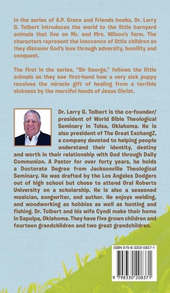 ***Based on a true story...*** In these times of trouble and confusion, many parents are struggling with the proper way to teach their children how to understand the world and the integral part that Jesus plays in each and every one of our lives. Renown Christian author, Dr. Larry Tolbert, has written a heartfelt set of children's books that approach often hard to understand issues in a sweet, thoughtful, entertaining, and biblically sound manner. In the series of A.P. Grace and Friends books, Dr. Tolbert introduces the world to the little barnyard animals that live on Mr. and Mrs. Wilson's farm. The characters represent the innocence of little children as they discover God's love through adversity, humility and conquest. The first in the series, "Sir George," follows the little animals as they see first hand how a very sick puppy receives the miracle gift of healing from a terrible sickness by the merciful hands of Jesus Christ. The book is tastefully and compassionately prepared, and presented in the proper fashion for young children's comprehension level.