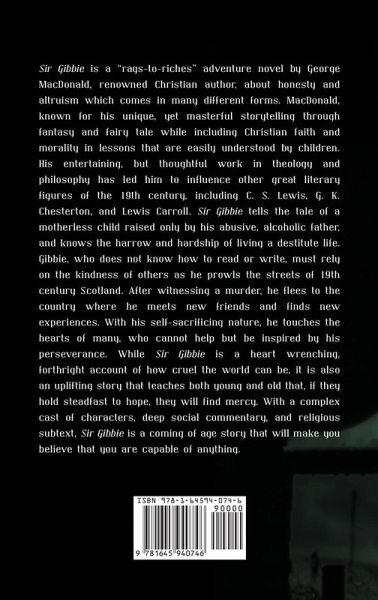 Sir Gibbie is a "rags-to-riches" adventure novel by George MacDonald, renowned Christian author, about honesty and altruism which comes in many different forms. MacDonald, known for his unique, yet masterful storytelling through fantasy and fairy tale while including Christian faith and morality in lessons that are easily understood by children. His entertaining, but thoughtful work in theology and philosophy has led him to influence other great literary figures of the 19th century, including C. S. Lewis, G. K. Chesterton, and Lewis Carroll. Sir Gibbie tells the tale of a motherless child raised only by his abusive, alcoholic father, and knows the harrow and hardship of living a destitute life. Gibbie, who does not know how to read or write, must rely on the kindness of others as he prowls the streets of 19th century Scotland. After witnessing a murder, he flees to the country where he meets new friends and finds new experiences. With his self-sacrificing nature, he touches the hearts of many, who cannot help but be inspired by his perseverance. While Sir Gibbie is a heart wrenching, forthright account of how cruel the world can be, it is also an uplifting story that teaches both young and old that, if they hold steadfast to hope, they will find mercy. With a complex cast of characters, deep social commentary, and religious subtext, Sir Gibbie is a coming of age story that will make you believe that you are capable of anything.