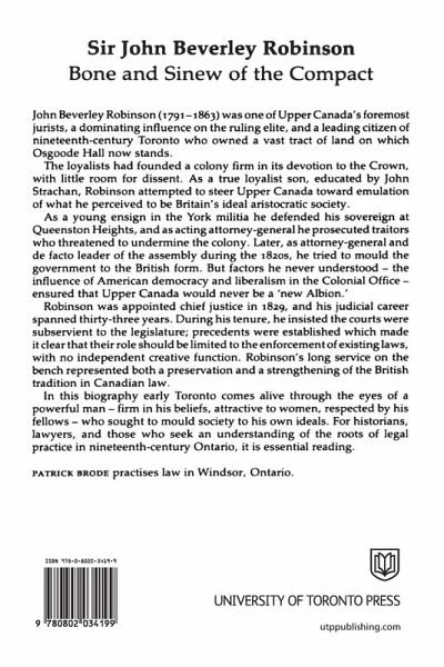 John Beverley Robinson (1791–1863) was one of Upper Canada’s foremost jurists, a dominating influence on the ruling Élite, and a leading citizen of nineteenth-century Toronto who owned a vast tract of land on which Osgoode Hall now stands. The loyalists had founded a colony firm in its devotion to the Crown, with little room for dissent. As a true loyalist son, educated by John Strachan, Robinson attempted to steer Upper Canada toward emulation of what he perceived to be Britain’s ideal aristocratic society. As a young ensign in the York militia, he defended his sovereign at Queenston Heights, and as acting attorney-general he prosecuted traitors who threatened to undermine the colony. Later, as attorney-general and de facto leader of the assembly during the 1820s, he tried to mould the government to the British form. But factors he never understood-the influence of American democracy and liberalism in the Colonial Office-ensured that Upper Canada would never be a ‘new Albion.’ Robinson was appointed chief justice in 1829, and his judicial career spanned thirty-three years, during which he insisted the courts were subservient to the legislature and established precedents declaring their role should be limited to the enforcement of existing laws, with no independent creative function. His long service on the bench represented both a preservation and a strengthening of the British tradition in Canadian law. In this biography, early Toronto comes alive through the eyes of a powerful man-firm in his beliefs, attractive to women, respected by his fellows-who sought to mould society to his own ideals. For historians, lawyers, and students of jurisprudence who seek an understanding of the roots of legal practice in nineteenth-century Ontario, it is essential reading.
