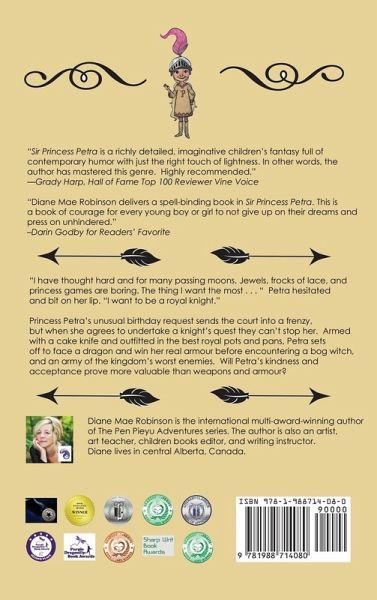Book #1 in the Multi-Award-Winning Humorous Fantasy Series for Kids. Princess Petra's unusual birthday request sends the court into a frenzy, but when she agrees to undertake a knight's quest they can't stop her. Armed with a cake knife and outfitted in the best royal pots and pans, Petra sets off to face a dragon and win her real armour before encountering a bog witch, and an army of the kingdom's worst enemies. Will Petra's kindness and acceptance prove more valuable than weapons and armour? Join Sir Princess Petra and the endearing dragon Snarls on their zany adventures in this fun-loving fantasy series for kids. Life lessons of courage, friendship, and believing in yourself will charm and entertain in these dragon stories for kids 7 - 11 years. Books in The Pen Pieyu Adventure series: Sir Princess Petra- The Pen Pieyu Adventures (book #1) Sir Princess Petra's Talent - The Pen Pieyu Adventures (book #2) Sir Princess Petra's Mission - The Pen Pieyu Adventures (book #3)