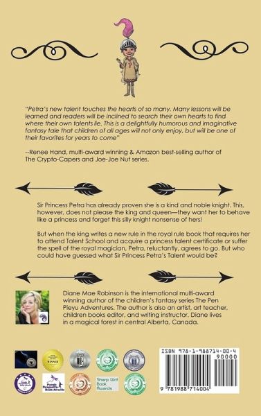 Book #2 in the Twelve-Time Award-Winning Fantasy Series For Kids. Amazingly fresh, charmingly funny, and embracing timeless values of kindness, understanding, and believing in oneself. Sir Princess Petra has already proven she is a kind and noble knight. This, however, does not please the king and queen---they want her to behave like a princess and forget this silly knight nonsense of hers! But when the king writes a new rule in the royal rule book that requires her to attend Talent School and acquire a princess talent certificate or suffer the spell of the royal magician, Petra, reluctantly, agrees to go. But who could have guessed what Sir Princess Petra's Talent would be? Join Sir Princess Petra, the endearing dragon Snarls, and the other quirky characters on their zany adventures in this fun-loving fantasy series for kids. Life lessons of courage, friendship, and believing in yourself will charm and entertain in these dragon stories for kids 7 - 11 years. Books in The Pen Pieyu Adventure series: Sir Princess Petra- The Pen PieyuAdventures (book #1) Sir Princess Petra's Talent - The Pen Pieyu Adventures (book #2) Sir Princess Petra's Mission - The Pen Pieyu Adventures (book #3)