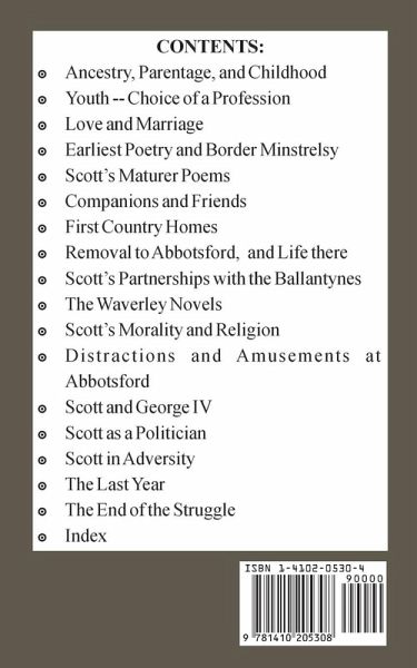 CONTENTS: Ancestry, Parentage, and Childhood Youth -- Choice of a Profession Love and Marriage Earliest Poetry and Border Minstrelsy Scott's Mature Poems Companions and Friends First Country Homes Removal to Abbotsford, and Life there Scott's Partnerships with the Ballantynes The Waverley Novels Scott's Morality and Religion Distractions and Amusements at Abbotsford Scott and George IV Scott as a Politician Scott in Adversity The Last Year The End of the Struggle Index