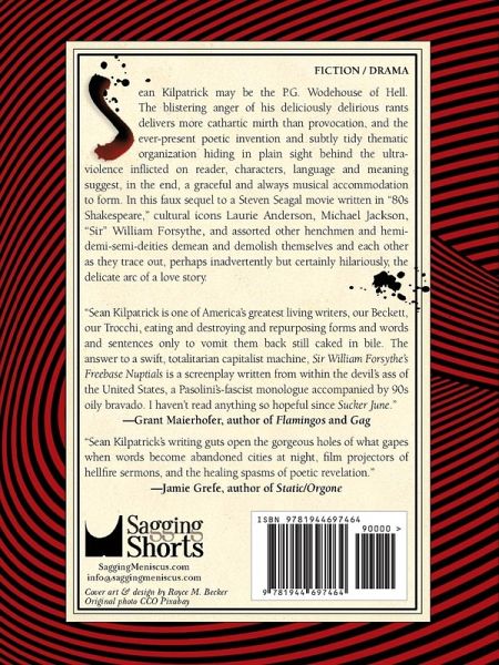 Sean Kilpatrick may be the P.G. Wodehouse of Hell. The blistering anger of his deliciously delirious rants delivers more cathartic mirth than provocation, and the ever-present poetic invention and subtly tidy thematic organization hiding in plain sight behind the ultra-violence inflicted on reader, characters, language and meaning suggest, in the end, a graceful and always musical accommodation to form. In this faux sequel to a Steven Seagal movie written in 80s Shakespeare, cultural icons Laurie Anderson, Michael Jackson, Sir William Forsythe, and assorted other henchmen and hemi-demi-semi-deities demean and demolish themselves and each other as they trace out, perhaps inadvertently but certainly hilariously, the delicate arc of a love story.