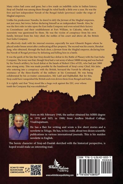 Many rulers had come and gone, but a few made an indelible niche in Indian history. Siraj-ud-Daulah was among them though he ruled hardly a little over a year. He was the first and last independent Nawab of the Bengal Subah (province) under the reign of Mughal emperors. Unlike his predecessor Nawabs, he dared to defy the farman of the Mughal emperors, not just once, but twice, before declaring himself as an independent Nawab. Also, he was the first ruler to take upon the East India Company and even seized their factory in Cossimbazar and their establishment at Fort William, in Calcutta, when his suzerainty was questioned by them. He was the victim of conspiracy from his own family, betrayal from his Amy chief, the nobles of his court and above all, the British East India Company. He effectively dealt with his internal enemies, especially his aunt Ghasetti Begam whom he placed under house arrest after confiscating all her property. The second was his cousin, Shoukat Jung, who obtained, through the back door, a farman from the Mughal emperor, declaring him the Nawab of Bengal province by defeating and killing him in a battle. It was the quirk of the fate that Siraj should face defeat in the Battle of Plassey with the East India Company. The irony was that, though Siraj had a vast army of about 50000 strong and was backed by the French artillery, he faced defeat at the hands of Robert Clive of EIL, who had just 3000 men strong army. This was made possible by the handiwork of Siraj's army Chief, Mir Jafar, who entering into a conspiracy with the British, betrayed the Nawab by offering no resistance of the three-fourths of the military at his Command. He was being collaborated by his co-traitor commanders, Mir Latif and Rajbhallab. But for this, Siraj could have vanquished the British and even driven them from Bengal and India. It is rightly said that "Siraj stood like a huge rock against the EIC, over whose tomb the Company Raj was established." About the Author: Born on 8th February 1948, the author obtained his MBBS degree in 1970 and MD, in 1980, from Andhra Medical College, Visakhapatnam. He has a flair for writing and wrote a few short stories and a novelette in Telugu. He has, to his credit, about two dozen scientific publications in various international journals. This is his maiden novelette in English. The heroic character of Siraj-ud-Daulah sketched with the historical perspective, is hoped would make an interesting read.