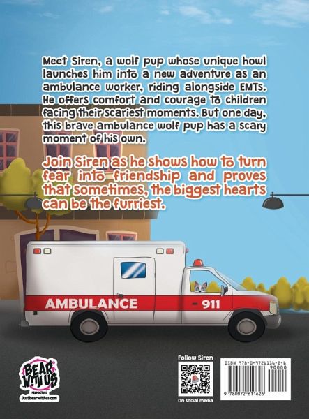 Meet Siren, a wolf pup with a unique howl that sounds just like an ambulance siren! He jumps into action one day during an emergency and uses his howl to clear the way for an ambulance through heavy traffic. This brave pup impresses the EMTs so much that they offer him a job as an official ambulance worker. Siren begins using his big heart, fuzzy gray fur, and wagging tail to comfort children during their rides to the hospital. He ends up turning what would normally be a scary trip, into a fun adventure. The kids all agree - meeting Siren was paws-down the highlight of their day! One day, however, Siren's bravery is put to the test when he meets a girl with a condition he's never encountered before. Even this fearless pup finds himself frightened. Can he find his courage and help his new friend? Ride along with Siren on his adventure as he discovers how friendship can ignite courage and conquer fear.