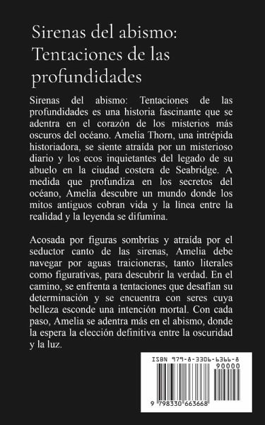 Sirenas del abismo: Tentaciones de las profundidades es una historia fascinante que se adentra en el corazón de los misterios más oscuros del océano. Amelia Thorn, una intrépida historiadora, se siente atraída por un misterioso diario y los ecos inquietantes del legado de su abuelo en la ciudad costera de Seabridge. A medida que profundiza en los secretos del océano, Amelia descubre un mundo donde los mitos antiguos cobran vida y la línea entre la realidad y la leyenda se difumina. Acosada por figuras sombrías y atraída por el seductor canto de las sirenas, Amelia debe navegar por aguas traicioneras, tanto literales como figurativas, para descubrir la verdad. En el camino, se enfrenta a tentaciones que desafían su determinación y se encuentra con seres cuya belleza esconde una intención mortal. Con cada paso, Amelia se adentra más en el abismo, donde la espera la elección definitiva entre la oscuridad y la luz.