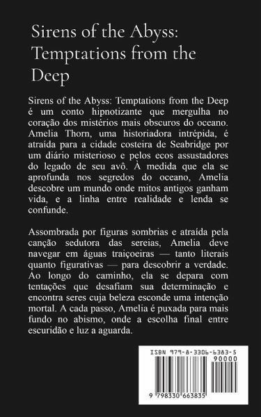 Sirens of the Abyss: Temptations from the Deep é um conto hipnotizante que mergulha no coração dos mistérios mais obscuros do oceano. Amelia Thorn, uma historiadora intrépida, é atraída para a cidade costeira de Seabridge por um diário misterioso e pelos ecos assustadores do legado de seu avô. À medida que ela se aprofunda nos segredos do oceano, Amelia descobre um mundo onde mitos antigos ganham vida, e a linha entre realidade e lenda se confunde. Assombrada por figuras sombrias e atraída pela canção sedutora das sereias, Amelia deve navegar em águas traiçoeiras - tanto literais quanto figurativas - para descobrir a verdade. Ao longo do caminho, ela se depara com tentações que desafiam sua determinação e encontra seres cuja beleza esconde uma intenção mortal. A cada passo, Amelia é puxada para mais fundo no abismo, onde a escolha final entre escuridão e luz a aguarda.