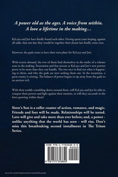 A power as old as the ages. A voice from within. A love a lifetime in the making… KyLaya and Jett have finally found each other. They have spent years hoping against all odds that one day they would be together - now their dream has come true. However, dreams don't last forever… The gods seem to have their own plans for KyLaya and Jett. With secrets abound, the two of them find themselves in the midst of a scheme eons in the making. Frustration and fear mount as KyLaya and Jett's new powers prove to be more than they can handle. The two race to find out what is happening to them, and why the gods are showing so much interest in them. In the meantime, a great enemy is stirring and with it the balance of power tips from the gods to an ancient evil. With their worlds crumbling down around them, will KyLaya and Jett be able to conquer their powers and fight against their enemies, or will they succumb to the force growing within them? Friends and foes will be made - but which is which? Siren's Son is a rollercoaster of action, romance, and magic. Relationships will be tested. Love will give and take more than ever before. Power unlike anything that the world has seen will rise. Don't miss this breathtaking second installment in The Triton Series.
