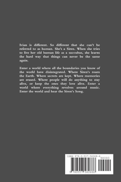 Ivian is different. So different that she can't be referred to as human. She's a Siren. When she tries to live her old human life as a succubus, she learns the hard way that things can never be the same again. Enter a world where all the boundaries you know of the world have disintegrated. Where Siren's roam the Earth. Where secrets are kept. Where memories are erased. Where people will do anything to stay alive, or keep the ones they love alive. Enter a world where everything revolves around music. Enter the world and hear the Siren's Song.