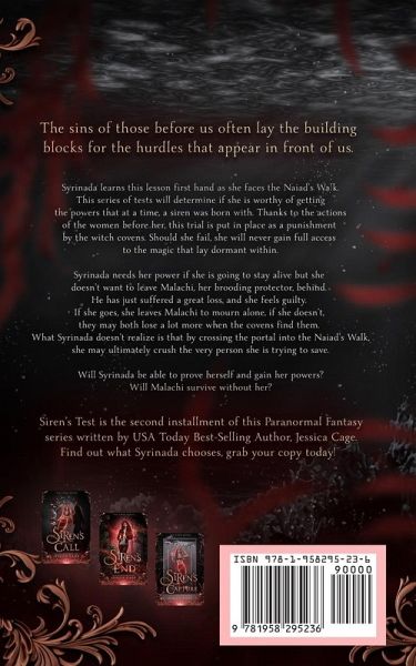 The sins of those before us often lay the building blocks for the hurdles that appear in front of us. Syrinada learns this lesson firsthand as she faces the Naiad's Walk. This series of tests will determine if she is worthy of getting the powers that at a time, a siren was born with. Thanks to the actions of the women before her, this trial is put in place as a punishment by the witch covens. Should she fail, she will never gain full access to the magic that lay dormant within. Syrinada needs her power if she is going to stay alive but she doesn't want to leave Malachi, her brooding protector, behind. He has just suffered a great loss, and she feels guilty. If she goes, she leaves Malachi to mourn alone, if she doesn't, they may both lose a lot more when the covens find them. What Syrinada doesn't realize is that by crossing the portal into the Naiad's Walk, she may ultimately crush the very person she is trying to save. Will Syrinada be able to prove herself and gain her powers? Will Malachi survive without her? Siren's Test is the second installment of the Siren Series, a Paranormal Fantasy series written by USA Today Best-Selling Author, Jessica Cage. Find out what Syrinada chooses, grab your copy today!