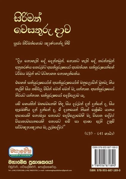 This book is about one of the past lives of the Gauthama Buddha. It is called Wessanthara Jatakaya. In one of his previous lives, he was born as the king Wessanthara. As the king Wessanthara, his generosity is extra-ordinary. He is ready to donate whatever is asked by others. He donates even his own son, daughter and wife. This is a heart touching story. You can learn how the Buddha-to-be practiced perfections ( Paramis) in order to attain enlightenment out of compassion for all beings.