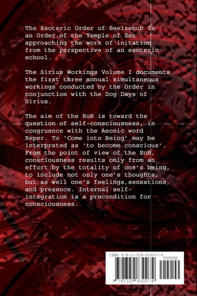 The Esoteric Order of Beelzebub is an Order of the Temple of Set approaching the work of initiation from the perspective of an esoteric school. The Sirius Workings Volume 1 documents the first three annual simultaneous workings conducted by the Order in conjunction with the Dog Days of Sirius. The aim of the EOB is toward the question of self-consciousness, in congruence with the Aeonic Word Xeper. To 'Come into Being' may be taken as 'to become conscious.' From the point of view of the EOB consciousness results only from an effort by the totality of one's being, to include not only one's thoughts, but as well one's feelings, sensations, and presence. Internal self-integration is a precondition for consciousness.