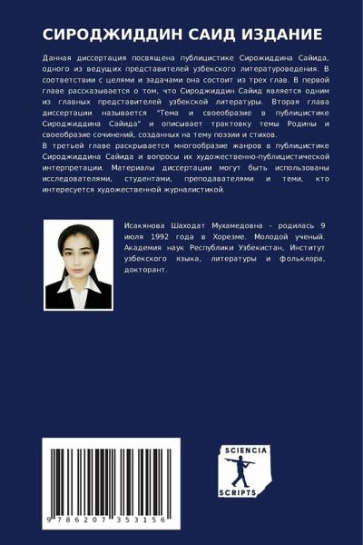 Dannaq dissertaciq poswqschena publicistike Sirozhiddina Sajida, odnogo iz weduschih predstawitelej uzbexkogo literaturowedeniq. V sootwetstwii s celqmi i zadachami ona sostoit iz treh glaw. V perwoj glawe rasskazywaetsq o tom, chto Sirodzhiddin Sajid qwlqetsq odnim iz glawnyh predstawitelej uzbexkoj literatury. Vtoraq glawa dissertacii nazywaetsq "Tema i swoeobrazie w publicistike Sirodzhiddina Sajida" i opisywaet traktowku temy Rodiny i swoeobrazie sochinenij, sozdannyh na temu poäzii i stihow.V tret'ej glawe raskrywaetsq mnogoobrazie zhanrow w publicistike Sirodzhiddina Sajida i woprosy ih hudozhestwenno-publicisticheskoj interpretacii. Materialy dissertacii mogut byt' ispol'zowany issledowatelqmi, studentami, prepodawatelqmi i temi, kto interesuetsq hudozhestwennoj zhurnalistikoj.