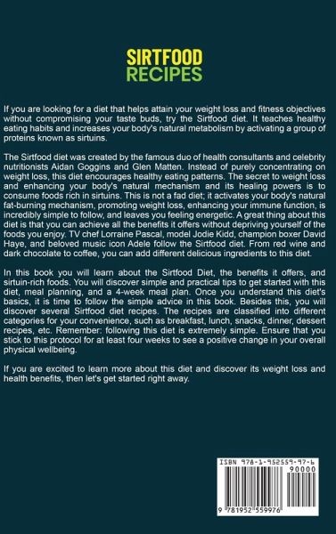 If you want to lose weight, burn fat, and improve your overall health with the Sirtfood diet, then keep reading... Do you want to shed those extra pounds but are tired of fad diets? Do you want a diet that helps attain your weight loss and fitness goals while improving your overall health? Do you want a diet sustainable in the long run? Do you want to do all this, but don't know where to start? If yes, then the Sirtfood diet is the perfect diet for you. The Sirtfood diet is relatively new, but it is steadily gaining popularity for all the right reasons. It is based on a simple concept of consuming foods rich in sirtuins to enhance your overall health. Sirtuins are natural proteins found in the body that maintain cellular health and balance. They also promote weight loss without depriving your body of the essential nutrients it needs. By following the simple recipes in this book, you can complete the two phases of the Sirtfood diet and improve your overall health. In this book, you will discover...The basics of the Sirtfood diet and how to get started Delicious and healthy Sirtfood recipes Tips to start meal planning A 4-week Sirtfood diet meal plan, and much more! So, what are you waiting for? To regain control of your health while attaining your fitness and weight loss goals, the Sirtfood diet is perfect. Take the first step toward attaining this goal by grabbing your copy today and get started!