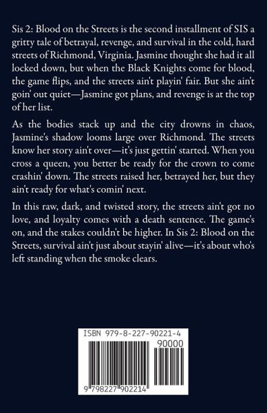 Sis 2: Blood on the Streets is the second installment of SIS a gritty tale of betrayal, revenge, and survival in the cold, hard streets of Richmond, Virginia. Jasmine thought she had it all locked down, but when the Black Knights come for blood, the game flips, and the streets ain't playin' fair. But she ain't goin' out quiet-Jasmine got plans, and revenge is at the top of her list. As the bodies stack up and the city drowns in chaos, Jasmine's shadow looms large over Richmond. The streets know her story ain't over-it's just gettin' started. When you cross a queen, you better be ready for the crown to come crashin' down. The streets raised her, betrayed her, but they ain't ready for what's comin' next. In this raw, dark, and twisted story, the streets ain't got no love, and loyalty comes with a death sentence. The game's on, and the stakes couldn't be higher. In Sis 2: Blood on the Streets, survival ain't just about stayin' alive-it's about who's left standing when the smoke clears.