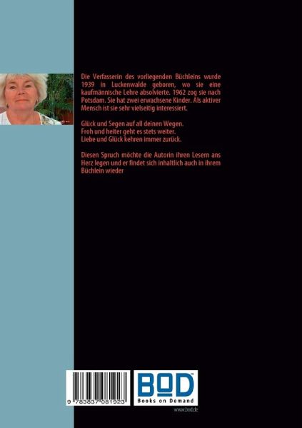 Die Verfasserin des vorliegenden Büchleins wurde 1939 in Luckenwalde geboren, wo sie eine kaufmännische Lehre absolvierte. 1962 zog sie nach Potsdam. Sie hat zwei erwachsene Kinder. Als aktiver Mensch ist sie sehr vielseitig interessiert.