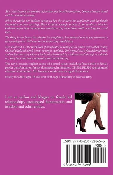 After experiencing the wonders of femdom and forced feminisation, Gemma becomes bored with her vanilla marriage. When she catches her husband spying on her, she re-starts his sissification and her female domination in their marriage. But it's still not enough. In book 3, she decides to drive her husband deeper into becoming her submissive sissy than before while searching for a real man. The thing is, she knows that despite his complaints, her husband used to pay mistresses to play at being sissy. Well now, he can be her sissy called Pansy. Sissy Husband 3 is the third book of an updated re-telling of an earlier series called A Sissy Cuckold Husband which is now no longer available. The original was a forced feminisation and sissification story where a husband is feminised by a Mistress and his wife as a double act. They turn him into a submissive and cuckolded sissy. This novel contains explicit scenes of a sexual nature including forced male to female gender transformation, female domination, humiliation, CFNM, BDSM, spanking and reluctant feminisation. All characters in this story are aged 18 and over. Strictly for adults aged 18 and over or the age of maturity in your country.