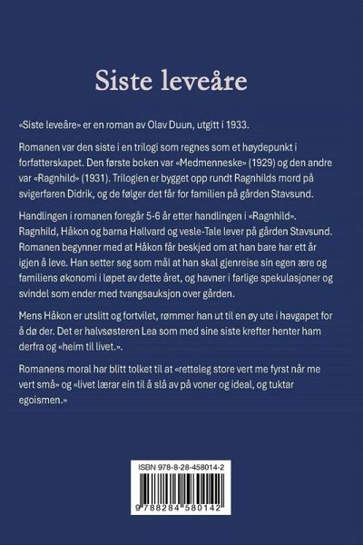 Siste leveåre er en roman av Olav Duun, utgitt i 1933. Romanen var den siste i en trilogi som regnes som et høydepunkt i forfatterskapet. Den første boken var Medmenneske (1929) og den andre var Ragnhild (1931). Trilogien er bygget opp rundt Ragnhilds mord på svigerfaren Didrik, og de følger det får for familien på gården Stavsund. Handlingen i romanen foregår 5-6 år etter handlingen i Ragnhild. Ragnhild, Håkon og barna Hallvard og vesle-Tale lever på gården Stavsund. Romanen begynner med at Håkon får beskjed om at han bare har ett år igjen å leve. Han setter seg som mål at han skal gjenreise sin egen ære og familiens økonomi i løpet av dette året, og havner i farlige spekulasjoner og svindel som ender med tvangsauksjon over gården. Mens Håkon er utslitt og fortvilet, rømmer han ut til en øy ute i havgapet for å dø der. Det er halvsøsteren Lea som med sine siste krefter henter ham derfra og heim til livet.. Romanens moral har blitt tolket til at retteleg store vert me fyrst når me vert små og livet lærar ein til å slå av på voner og ideal, og tuktar egoismen.