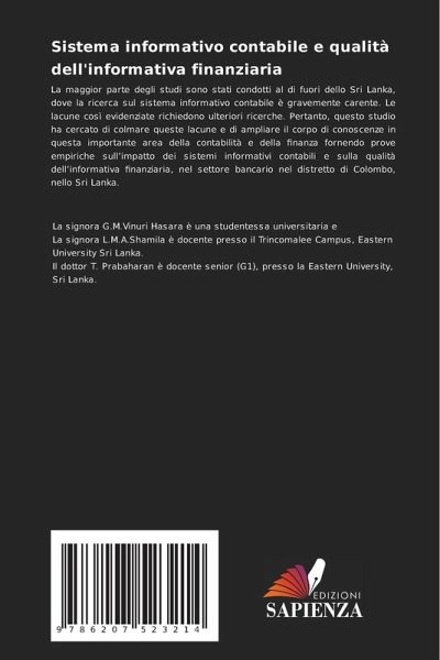 La maggior parte degli studi sono stati condotti al di fuori dello Sri Lanka, dove la ricerca sul sistema informativo contabile è gravemente carente. Le lacune così evidenziate richiedono ulteriori ricerche. Pertanto, questo studio ha cercato di colmare queste lacune e di ampliare il corpo di conoscenze in questa importante area della contabilità e della finanza fornendo prove empiriche sull¿impatto dei sistemi informativi contabili e sulla qualità dell¿informativa finanziaria, nel settore bancario nel distretto di Colombo, nello Sri Lanka.