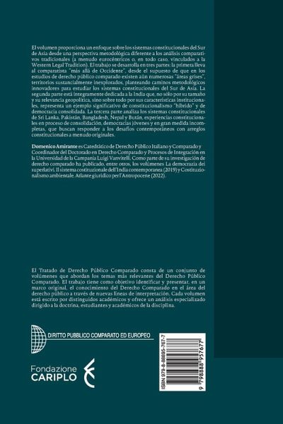 El volumen del profesor Domenico Amirante proporciona un enfoque sobre los sistemas constitucionales del Sur de Asia desde una perspectiva metodológica diferente a los análisis comparativos tradicionales (a menudo eurocéntricos o, en todo caso, vinculados a la Western Legal Tradition). El trabajo se desarrolla en tres partes: la primera lleva al comparatista "más allá de Occidente", desde el supuesto de que en los estudios de derecho público comparado existen aún numerosas "áreas grises", territorios sustancialmente inexplorados, planteando caminos metodológicos innovadores para estudiar los sistemas constitucionales del Sur de Asia. La segunda parte está íntegramente dedicada a la India que, no sólo por su tamaño y su relevancia geopolítica, sino sobre todo por sus características institucionales, representa un ejemplo significativo de constitucionalismo "híbrido" y de democracia consolidada. La tercera parte analiza los sistemas constitucionales de Sri Lanka, Pakistán, Bangladesh, Nepal y Bután, experiencias constitucionales en proceso de consolidación, democracias jóvenes y en gran medida incompletas, que buscan responder a los desafíos contemporáneos con arreglos constitucionales a menudo originales.