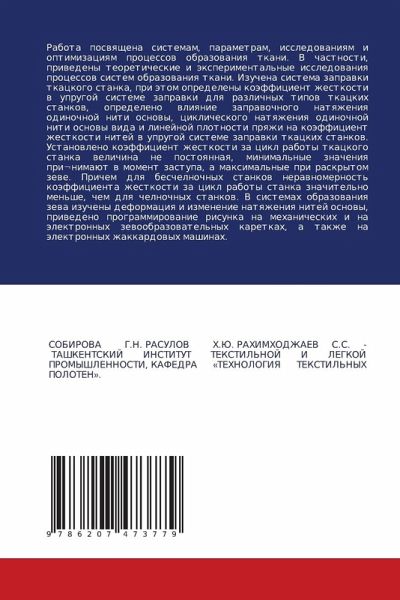 Rabota poswqschena sistemam, parametram, issledowaniqm i optimizaciqm processow obrazowaniq tkani. V chastnosti, priwedeny teoreticheskie i äxperimental'nye issledowaniq processow sistem obrazowaniq tkani. Izuchena sistema zaprawki tkackogo stanka, pri ätom opredeleny koäfficient zhestkosti w uprugoj sisteme zaprawki dlq razlichnyh tipow tkackih stankow, opredeleno wliqnie zaprawochnogo natqzheniq odinochnoj niti osnowy, ciklicheskogo natqzheniq odinochnoj niti osnowy wida i linejnoj plotnosti prqzhi na koäfficient zhestkosti nitej w uprugoj sisteme zaprawki tkackih stankow. Ustanowleno koäfficient zhestkosti za cikl raboty tkackogo stanka welichina ne postoqnnaq, minimal'nye znacheniq pri¬nimaüt w moment zastupa, a maximal'nye pri raskrytom zewe. Prichem dlq beschelnochnyh stankow nerawnomernost' koäfficienta zhestkosti za cikl raboty stanka znachitel'no men'she, chem dlq chelnochnyh stankow. V sistemah obrazowaniq zewa izucheny deformaciq i izmenenie natqzheniq nitej osnowy, priwedeno programmirowanie risunka na mehanicheskih i na älektronnyh zewoobrazowatel'nyh karetkah, a takzhe na älektronnyh zhakkardowyh mashinah.